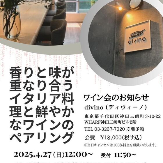 by場所:divino(ディヴィーノ) 〒101-0061 東京都千代田区神田三崎町3-10-22 WHARF神田三崎町ビル2階 03-3237-7020 JR線【水道橋駅】西口から徒歩5分 東京メトロ 東西線・半蔵門線【九段下駅】出口5から徒歩7分 (公共交通機関をご利用ください。)2025年4月27日(日)~2025年4月27日(日)