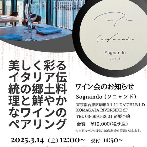 by場所:Sognando(ソニャンド) 〒111-0043 東京都台東区駒形2-1-11 DAICHI B.L.D KOMAGATA RIVERSIDE 2F 都営大江戸線【蔵前駅】A7出口から徒歩2分 都営浅草線【浅草駅】A2a出口から徒歩3分 東京メトロ銀座線【浅草駅】4番出口から徒歩6分 (公共交通機関をご利用ください。)2026年3月14日(土)~2026年3月14日(土)