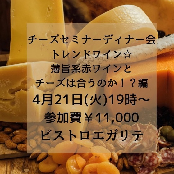 チーズセミナー&ディナー会〜トレンドワイン☆薄旨系赤ワインとチーズは合うのか!?編〜