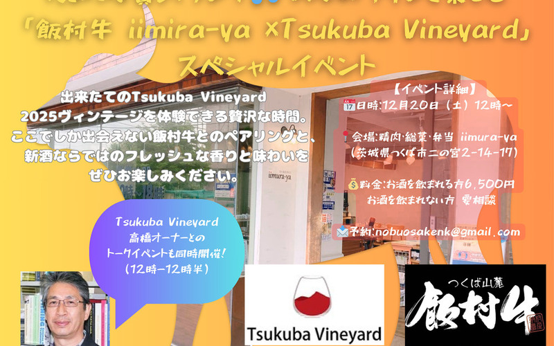 たまには贅沢ランチ♫ つくばのワインと楽しむ「飯村牛 iimura-ya × Tsukuba Vineyard」スペシャルイベント