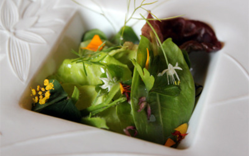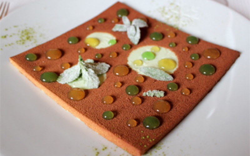 独特のハーブのムースのようなテクスチャーのキャンバスにあらゆる香草や花から抽出したカラフルで透明感のあるソースのコンビになっています。