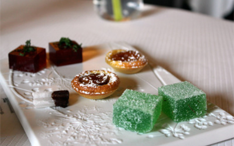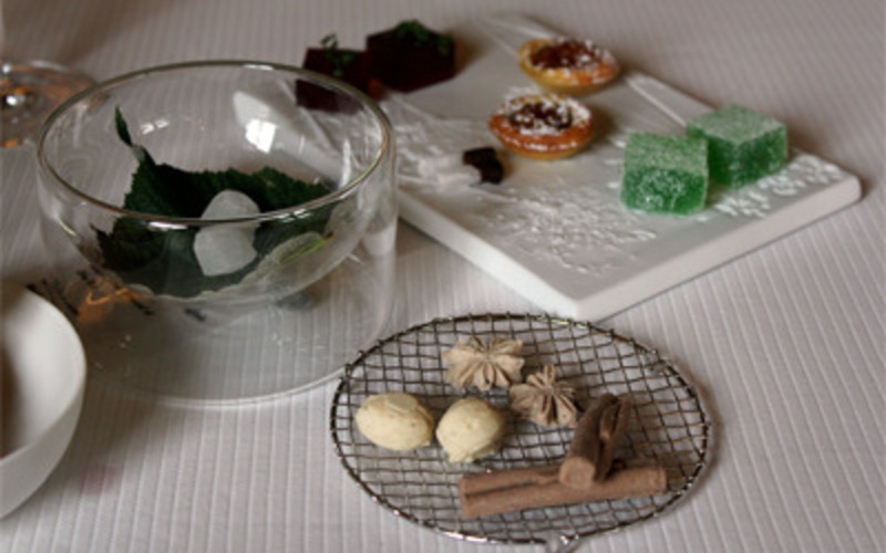 赤紫蘇のゼリー、もみの木のボンボン、ミラベルのタルトレット、シャルトリューズのパテ