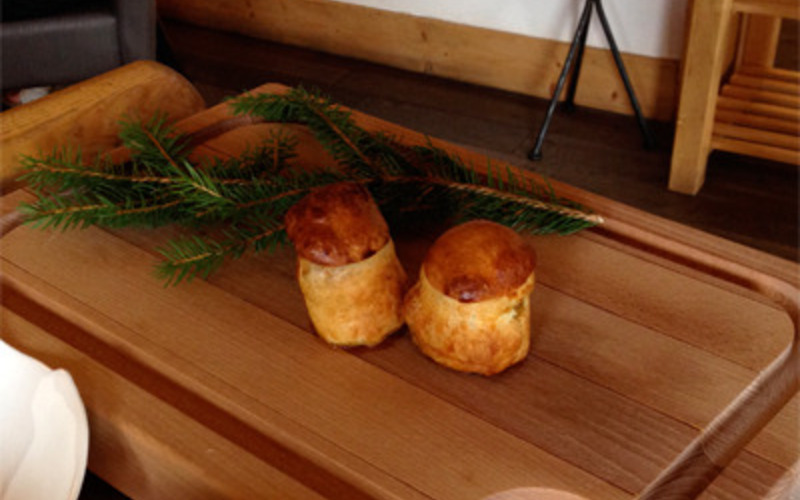下に敷かれている樹は、例のランプで煙がでるまで熱され、その上にタルトレットが飾られ、香りはまるで、山小屋の暖炉を思わせます。