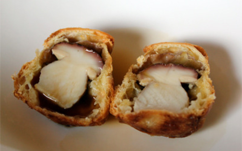 ポルチーニのアン・クルートを作った際に、切りそろえた茎とか、ジロール、シャントレル、ムースロンなど、いろんなキノコが全部1センチ以下の大きさに奇麗に切りそろえられて、ほのかにアマレットの香りをつけたサヴァイヨンが上から添えられ、塩漬けしてボッタルガのように乾燥された、卵黄が削られてサービスされます。