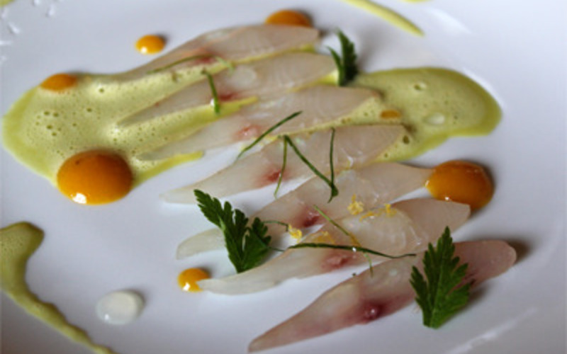 フェラのコンフィ、瞬間燻製、イワミツバとレモン風味のバターソース
