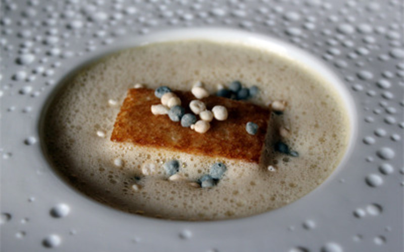 ・Lotte du lac et brochet en biscuit, jus d'orange paille