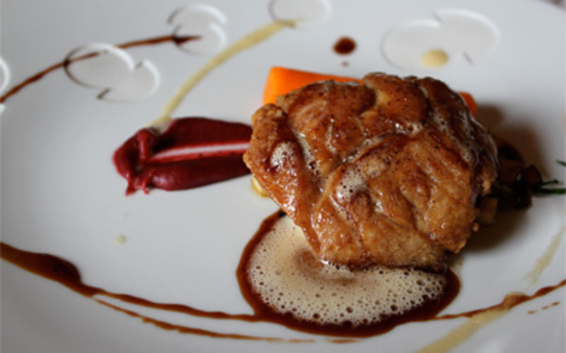 ・Noix de ris de veau dorée, mousseline d'échalote prune bleue, carottes miel citron, jus à l'Angustura et marjolaine