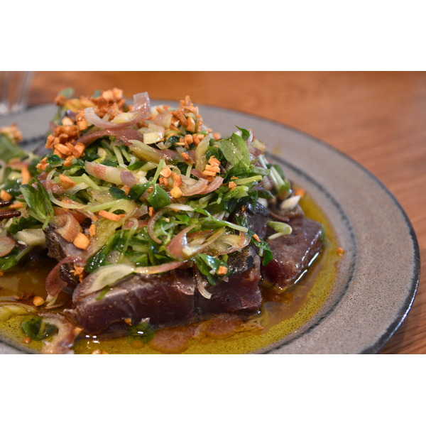 フレッシュな酸味とポン酢の酸味、豆苗の青々しさが心地よくマッチ。カツオ+ポン酢の味の強さと料理のボリューム感もちょうど良いバランスに。