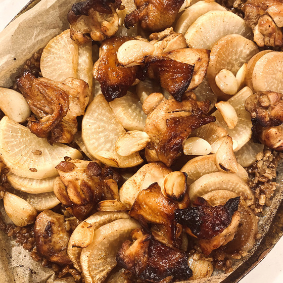 鶏ももと大根ともち麦のオープン焼き